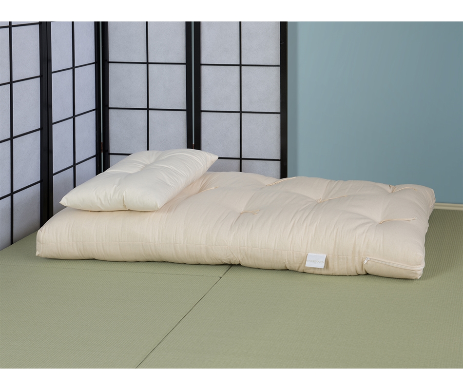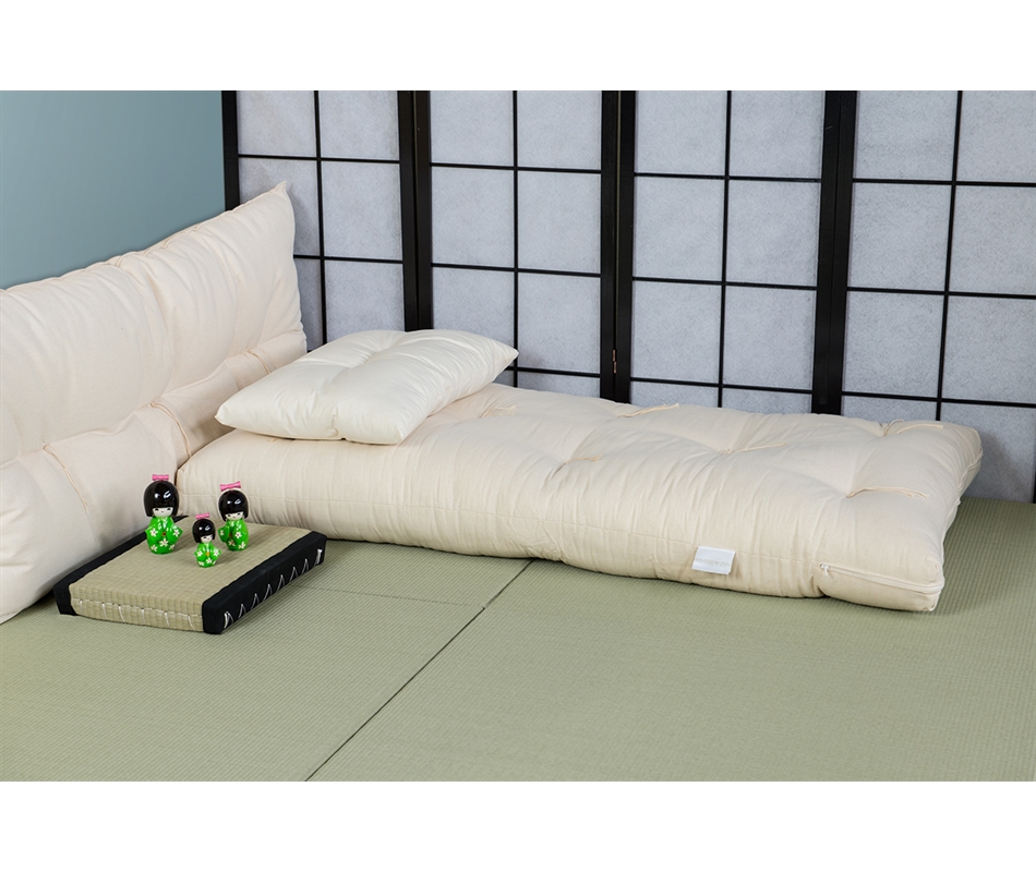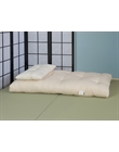 Futon formato da 4 strati di cotone 100% naturale. Altezza 10/11 cm. Rivestimento in cotone 100% naturale. Cerniera d'ispezione. Indicato per l'uso come materasso per bambini. Il tatami e i cuscini non sono compresi nel prezzo.