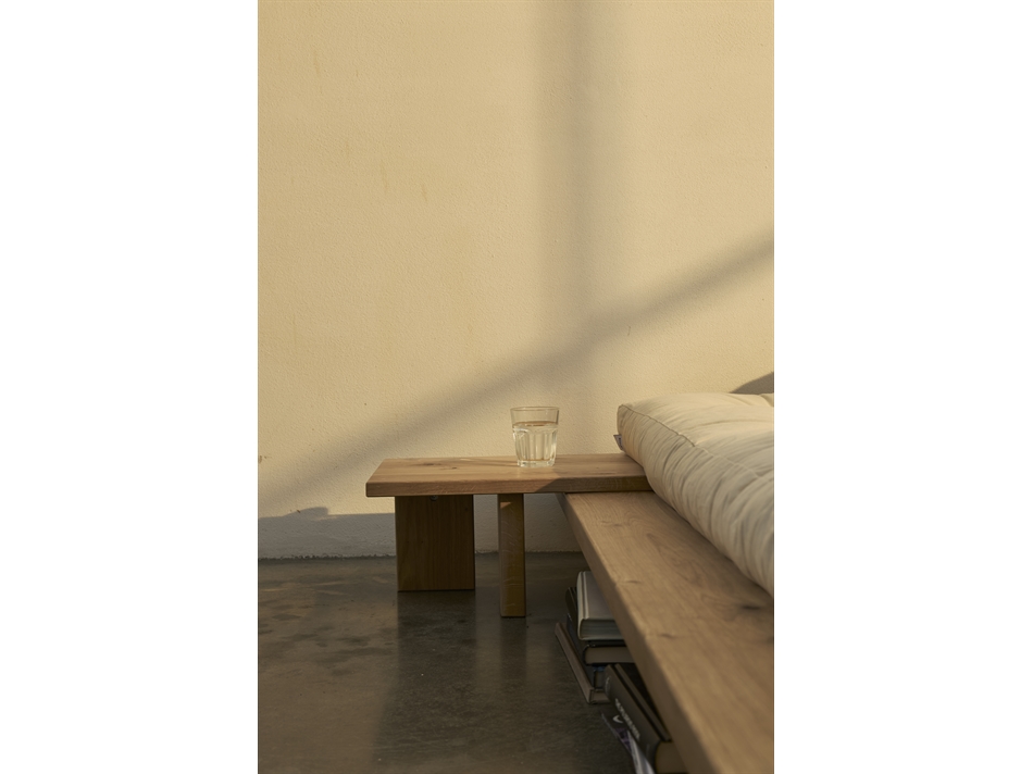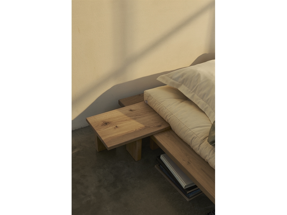 Con un design estremamente lineare, il letto Japan si caratterizza principalmente per il particolare intreccio dei piedi, formati da due rettangoli in legno posti perpendicolarmente tra loro.