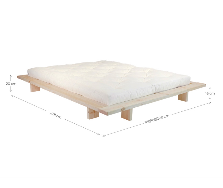 Puoi usare dei tatami ribassati (non inclusi nel prezzo) sopra le doghe per avere una base su cui poggiare il futon. Il futon acquistato potrà essere delle stesse dimensioni dell'interno letto, un po' più grande andando a coprire parte del giroletto in legno, oppure un po' più piccolo, in modo da far vedere i tatami.